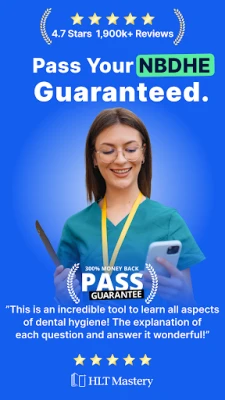 Download Dental Hygiene Exam prep and access 1450+ practice questions, explanations, and detailed results tracking. With our Dental Hygiene board review app, you will CRUSH the NBDHE exam!