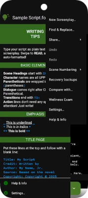 ✓ Built-in Wellness Exam scans for potential Fountain/format issues, screenplay "clams", red flags, etc