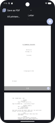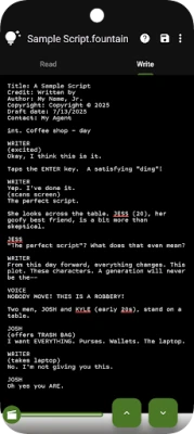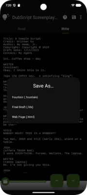 DubScript supports Fountain markup, a popular, open standard for writing scripts in plain-text. This means your screenplay file is fully-compatible with any old plain-text editor. To exchange with other apps, just copy and paste. Or hit the Share button to forward yourself (or your agent) a quick off-device backup via an email or messaging app.