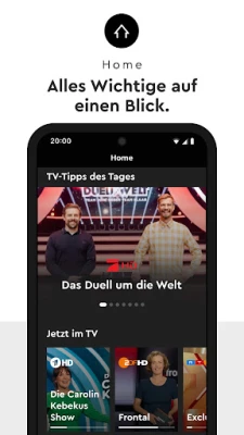 Auf der Startseite der App siehst du das aktuelle Live-Programm, Empfehlungen aus den Mediatheken und TV-Tipps für die kommenden Tage.