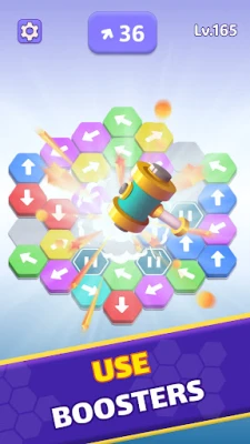 Use helpful tools like hammers, bombs, and hints to clear tricky hexa levels and power through tough puzzles.