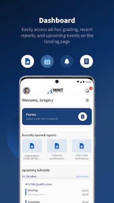 MINT TMS app is the on-the-go connection to the MINT Training Management System, MINT TMS. The app allows you to quickly and easily access up-to-date schedule info, complete forms (online or offline), visualize reports on MINT data, and display automatic notifications.