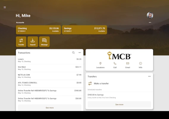 Here’s what you can do with the MCB mobile banking app: Set up alerts so you know when your balance drops below a certain amount Make payments, whether you’re paying a company or a friend Transfer money between your accounts Deposit checks in a snap by taking a picture of the front and back Reorder your debit card or turn it off if you’ve misplaced it View and save your monthly statements Find branches and ATMs near you Secure your account with a 4-digit passcode or biometric on supported devices.